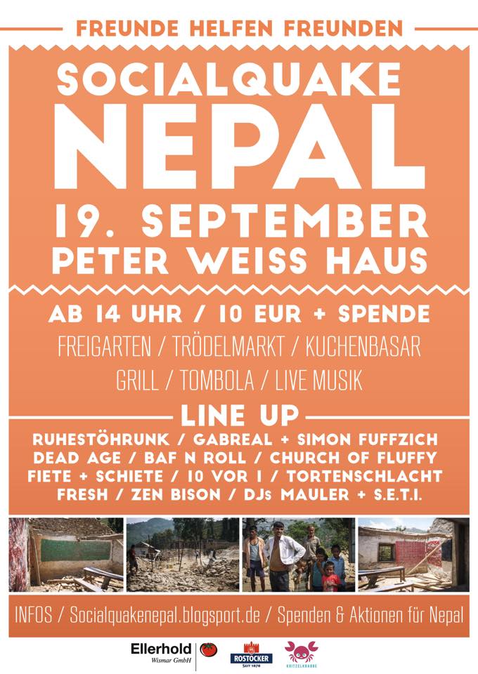 Am 19. September trete ich mit meinem DJ Simon Fuffzich mal wieder in Rostock auf. Das Event heißt „Social Quake“ und ist eine Benefiz-Veranstaltung für die Nepal-Hilfe. Viele von euch werden sich erinnern, dass es im April und Mai ein schweres Erdbeben im Himalaya-Gebirge gab, bei dem Nepal heftig zerstört wurde. Mehr als 2400 Menschen kamen bei dieser schweren Katastophe ums Leben. Rund 20.000 Menschen wurden im Himalaya verletzt. Häuser und Wohnungen wurden zerstört, von den Stätten des Weltkulturerbes ganz zu schweigen.